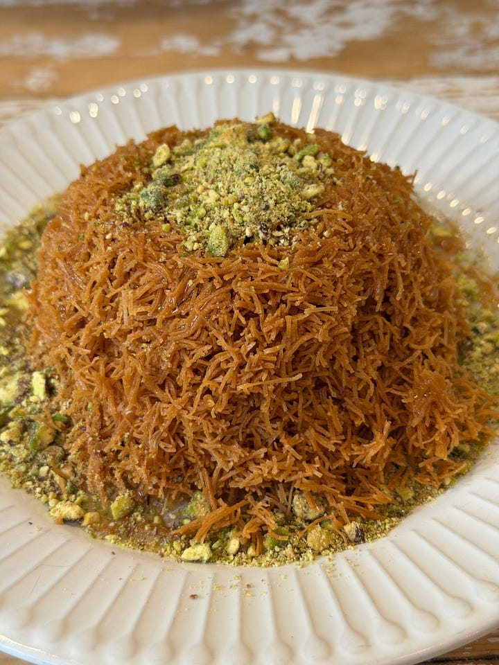 Elegimos el knafeh. Una mezcla de masa fina de sémola (kunafa), relleno de crema, con pistachos y una salsa de sirope. Estaba bien grande así que decidimos compartir. La pequeña victoria fue descubrir un lugar nuevo que se vuelve favorito.